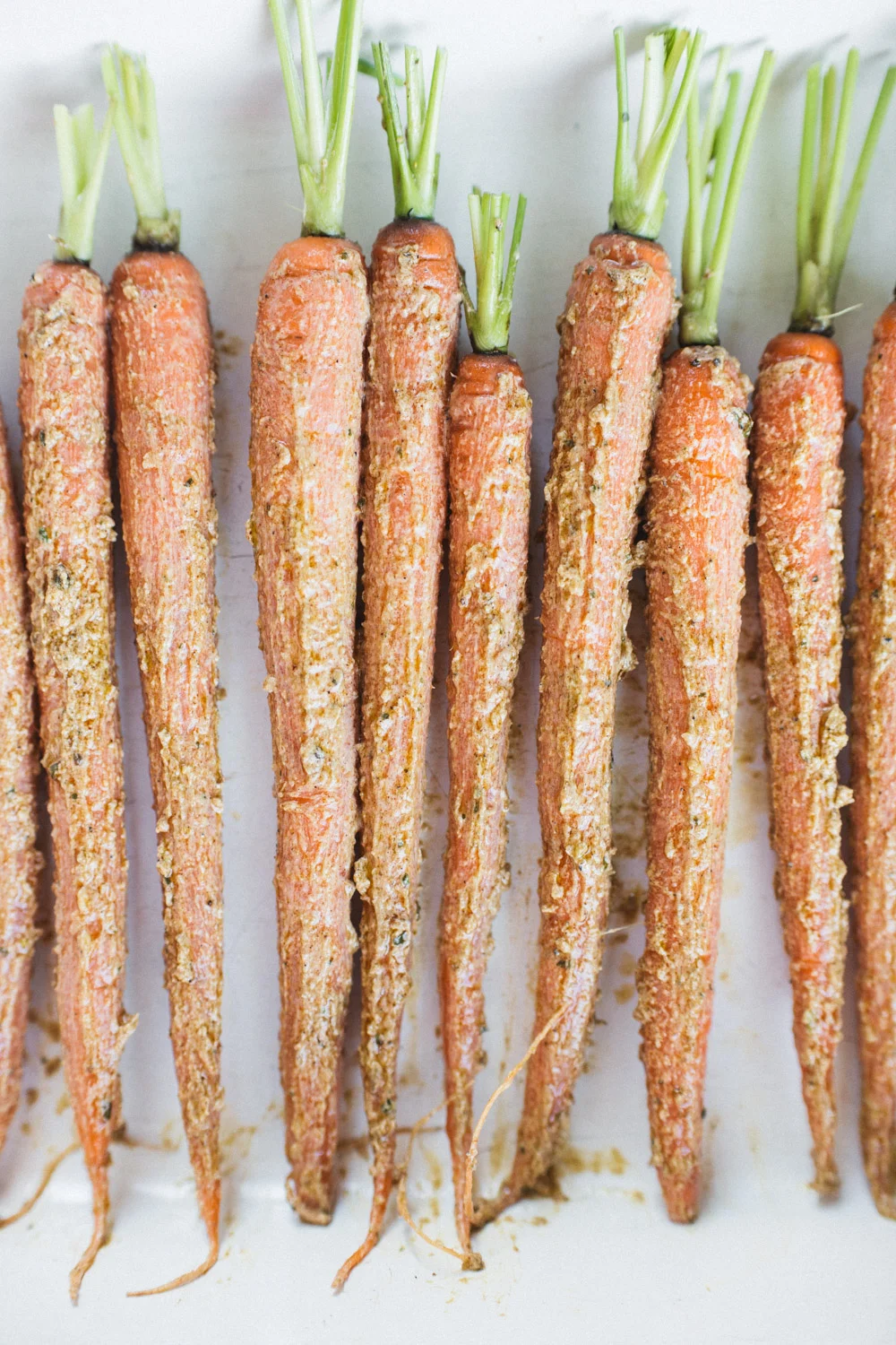 Add mix to carrots and coat, making sure to cover them evenly with a thin layer all around. Place evenly (about 1/4 to 1/2" apart from each other) on a rimmed baking sheet or large buttered shallow pyrex. Place in oven for 25-35 minutes, or until you begin to see some browning and light charring on ends. Also note that the curry coating should have crisped (not soggy paste still), and the carrots should be relatively tender if tested with a fork; they should taste sweet.